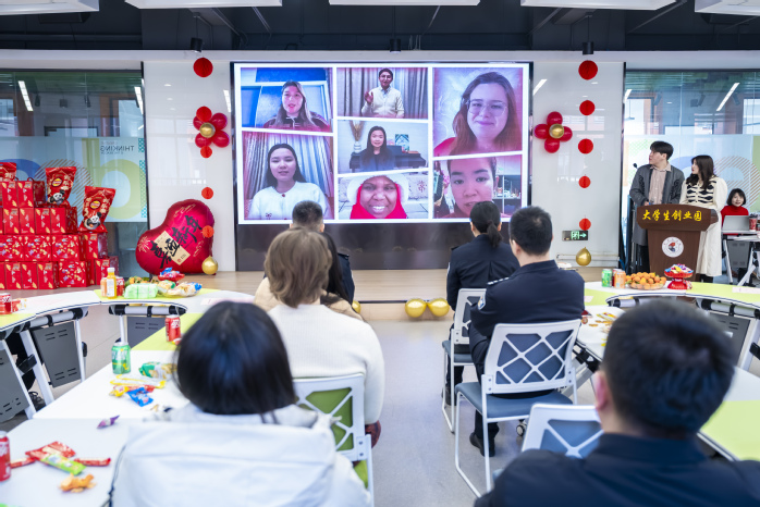 联欢会在喜庆祥和的氛围中拉开帷幕。金政首先向与会人员介绍了莅临现场的领导和嘉宾,并对各方给予学院国际化办学工作的长期支持表示衷心感谢。随后,大屏幕播放了留学生及校友从世界各地发来的新春祝福视频。来自俄罗斯、苏丹古巴、哈萨克斯坦等国的留学生及校友在镜头前用中文表达新春祝福,跨越时空的情谊温暖全场。