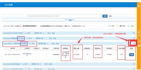 选上的课程会在右边任务栏提示状态为已选。